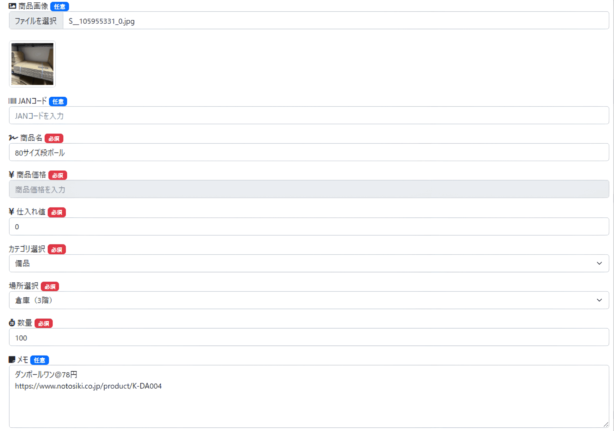 • ダンボールや緩衝材などをカテゴリに「備品」として登録