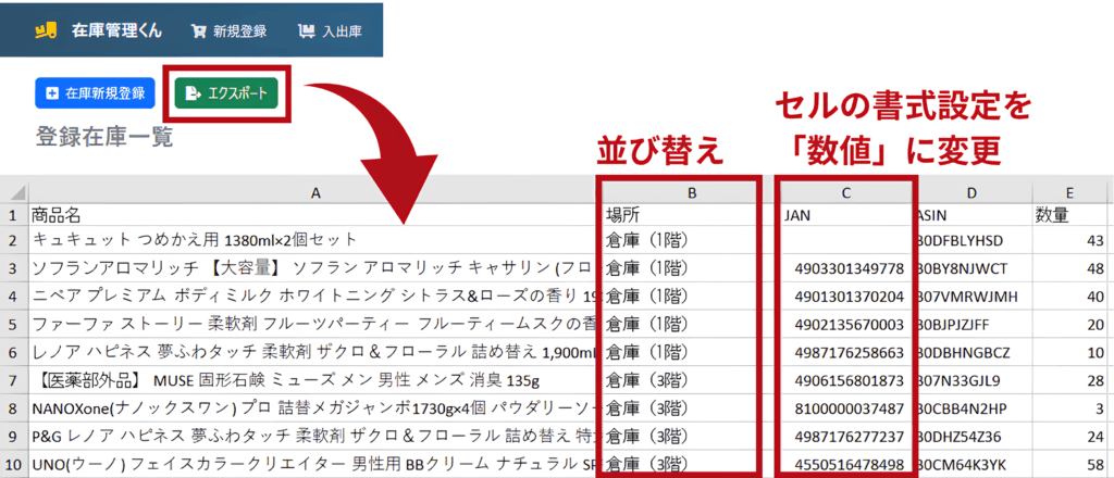 在庫数が多い場合は、「場所」でソートしてから、その場所ごとにエクスポートする方法もおすすめです。
